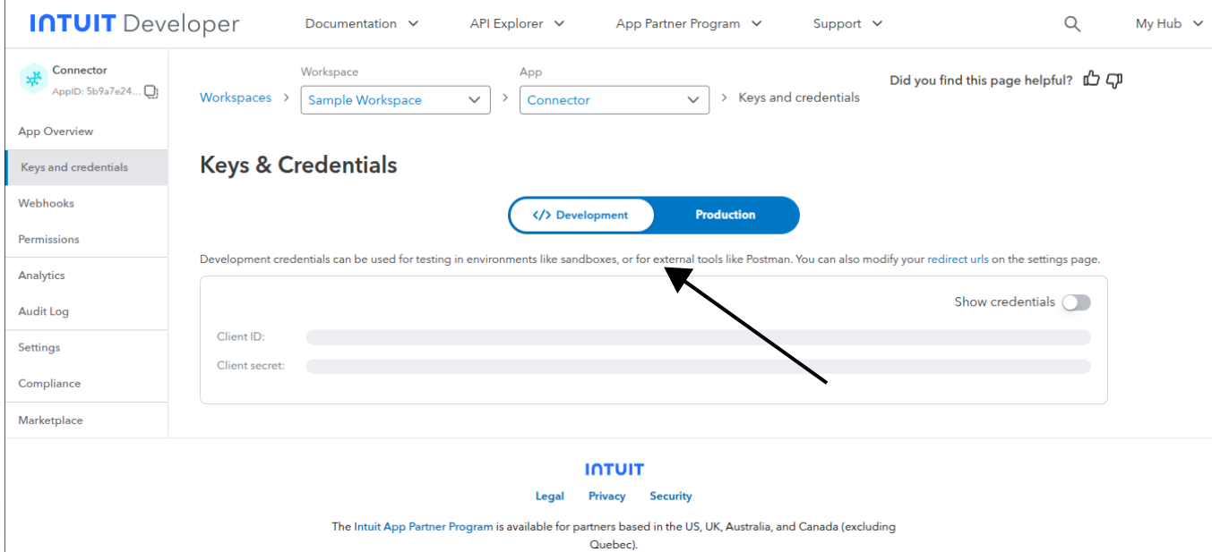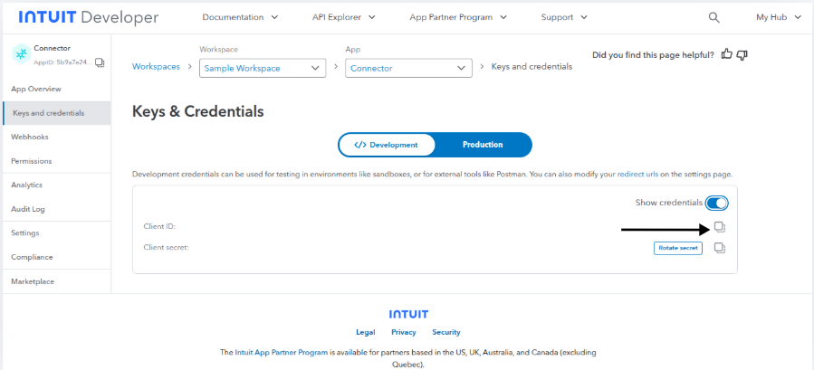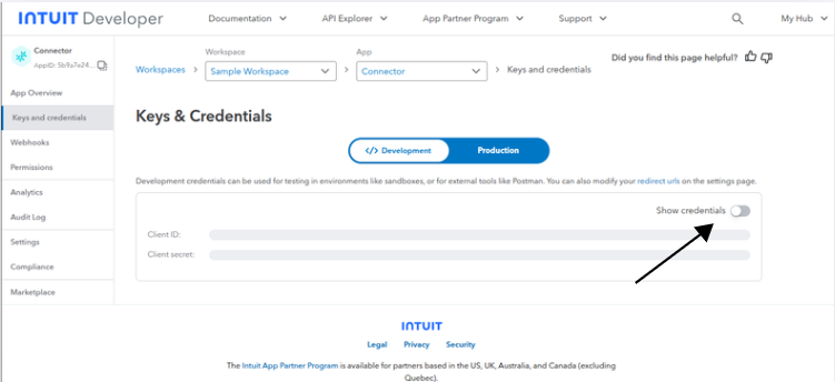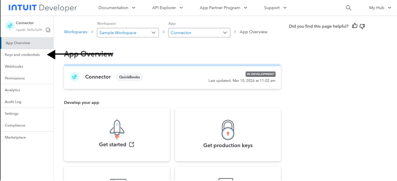 Go to the Intuit Developer Portal and sign in. Select your app from the workspace to open the App Overview page. Click Keys and credentials in the left sidebar.