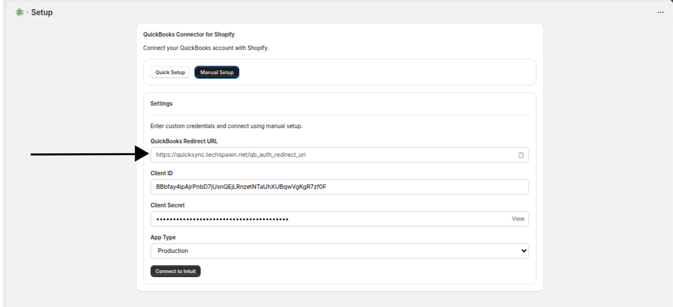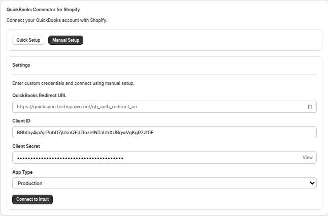 Connect your QuickBooks account to Shopify using custom credentials with Manual Setup